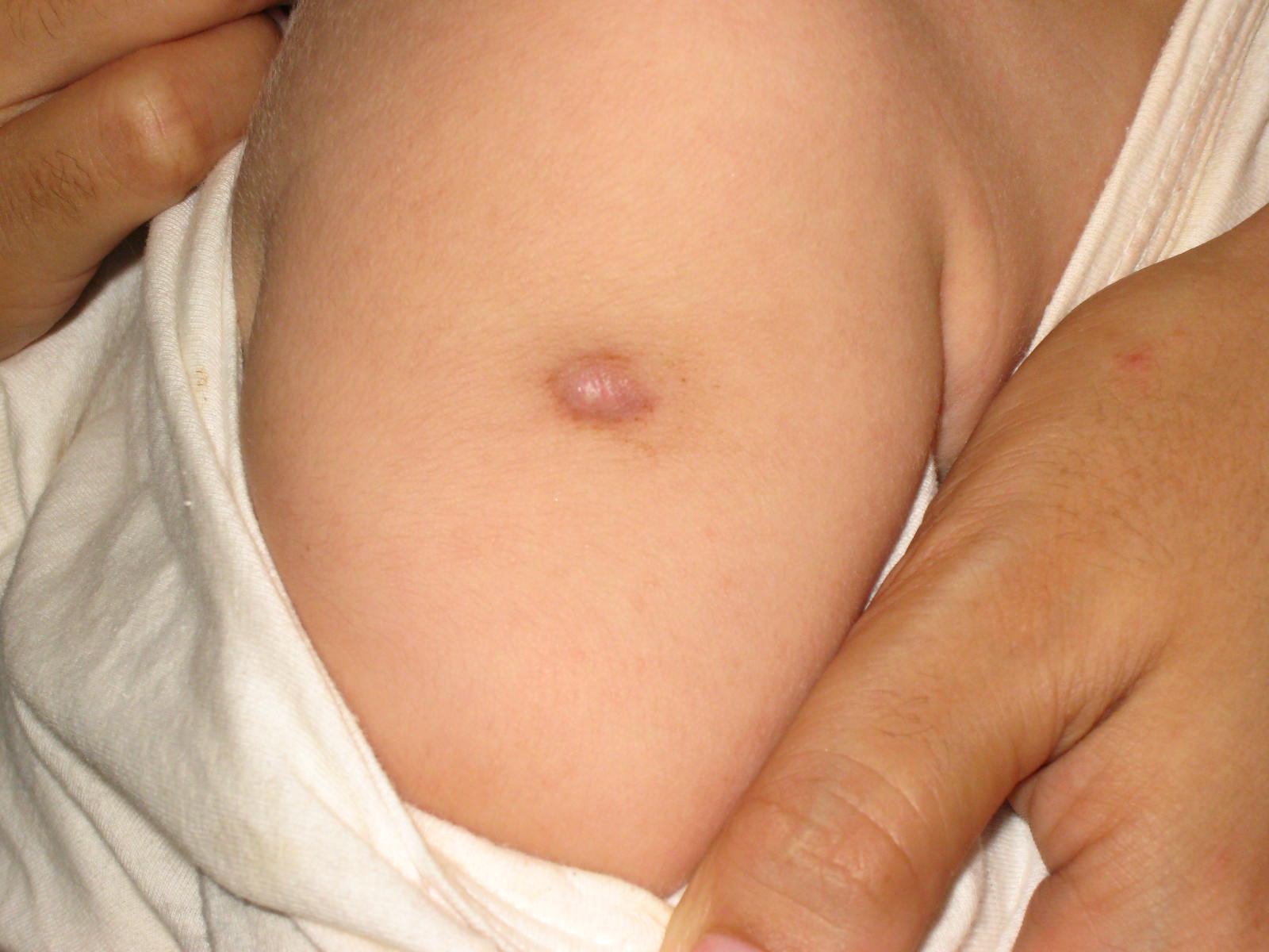目前是没有感染迹象,我们也是第一次碰到这种反应,也考虑是无菌脓疡,可现在差不多两个月了,还是没有痊愈,照片就是8月8日拍的,当天接种乙肝疫苗的共3个儿童,就这个有事,考虑误种卡介苗也不可能,因为卡介苗是单独一个接种室的,所以8月8日家长再带小孩来时只好告诉家长继续观察。