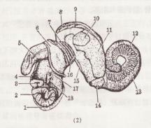 1:厣;2:足;3:嘴;4:眼;5:阴茎;6:外套膜;7:鳃;8:肠;9:前列腺;10:肾腺;11:肾脏;12:精巢;13:肝脏;14:胃;15:食管;16:纺锤肌;17:假眉;18:触角;19:副腺;20卵巢;21:心脏。