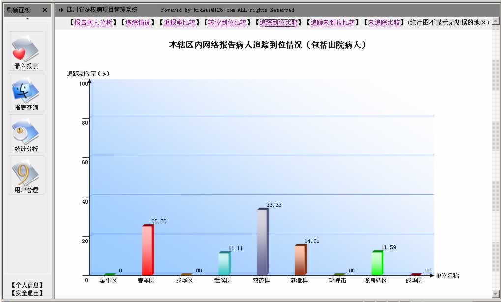 1、在线录入月报表功能:每月1日到20日县级可以录入当月月报表,省级和市州可以实时查看辖区内各个县区当月报表报送情况; 2、在线修改当月报表:每月1日到10日县级报送人员可以修改本单位报送的当月报表; 3、实时浏览辖区的报表数据:系统可以根据用户选择的月份、单位(仅本辖区的单位)留言既往以及当月报表数据,以及汇总数据; 4、实时统计图表功能:对当前输入的表进行可疑者构成、各辖区内市县追踪到位率、转诊率等比较;分析图包括饼图、柱状图、线图等;