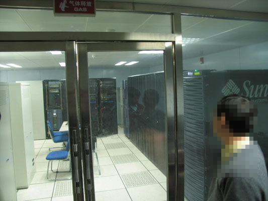 四楼信息中心机房,老师说可以照,我们就没客气地按下了快门,最里面的就是机柜所在地,