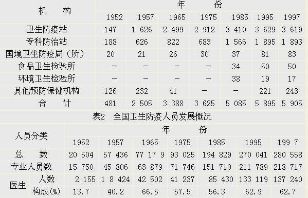 卫生防疫事业经过半个世纪的实践和总结,到20世纪90年代已渐臻完善。卫生防疫行政管理 部门和卫生防疫业务部门从两个方面承担着卫生防疫工作任务,构成了一个完整卫生防疫体 系。行政部门负责确定卫生防疫发展政策,制定工作计划,组织协调与管理;业务部门负责疾病控制与监测、卫生监督、健康教育与促进、科学研究和人员培训等。卫生防疫专业 机构由1952年的481个发展到1997年的5 905个,专业技术人员由15 750人增加到 218 717人,分别增长了11.3倍和12.9倍(表1和表2),是一支常年奋战在卫生 防疫第一线的健康卫士。
