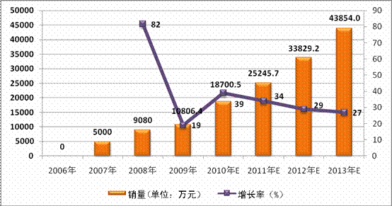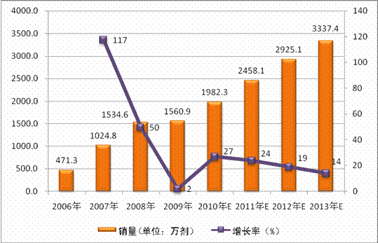 图表 12:2006年-2013年b型流感嗜血杆菌结合疫苗市场规模及趋势(按销量)