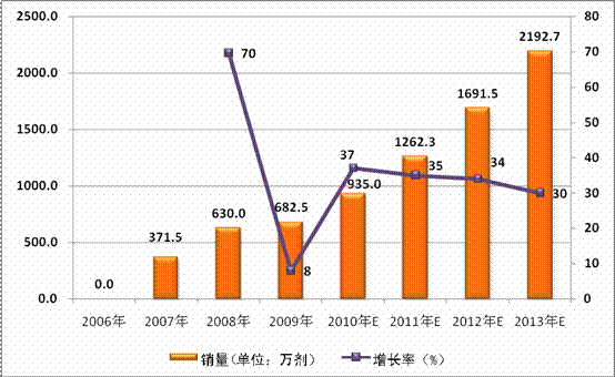 A、C群脑膜炎球菌结合疫苗2007年上市,规模为371.5万剂,2008年有增长较快,达到630万剂,到2009年销量为达到682.5万剂。以2009年为基数,预计该疫苗将以34%左右的复合增长率增长,到2013年市场规模达到2200万剂左右。