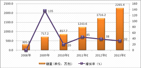 图表 9:2008年-2013年ACYW135群脑膜炎球菌多糖疫苗市场规模及趋势(按销量)