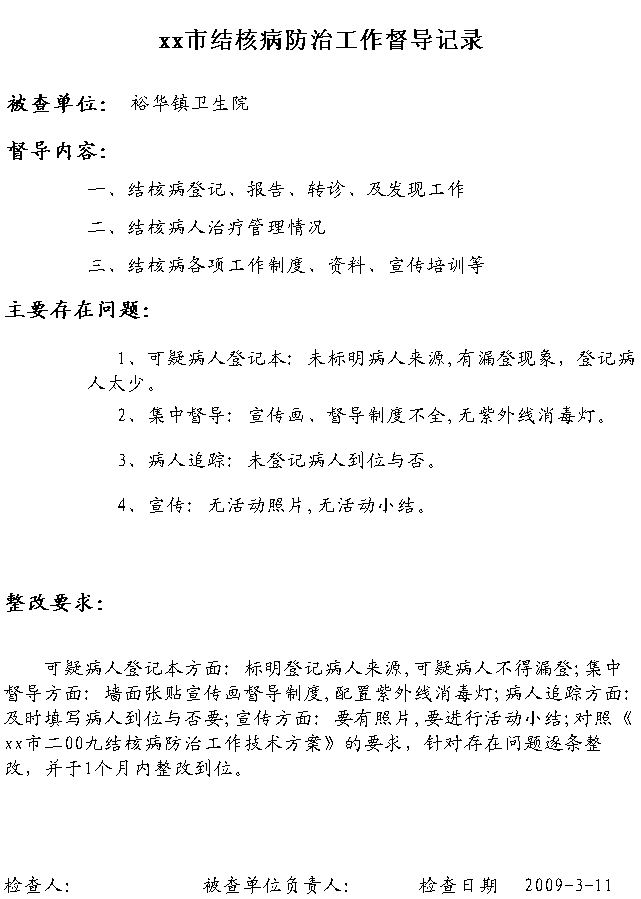 可疑病人登记本方面: 标明登记病人来源,可疑病人不得漏登;集中督导方面: 墙面张贴宣传画督导制度,配置紫外线消毒灯;病人追踪方面: 及时填写病人到位与否要;宣传方面: 要有照片,要进行活动小结;对照《xx市二00九结核病防治工作技术方案》的要求,针对存在问题逐条整改,并于1个月内整改到位。