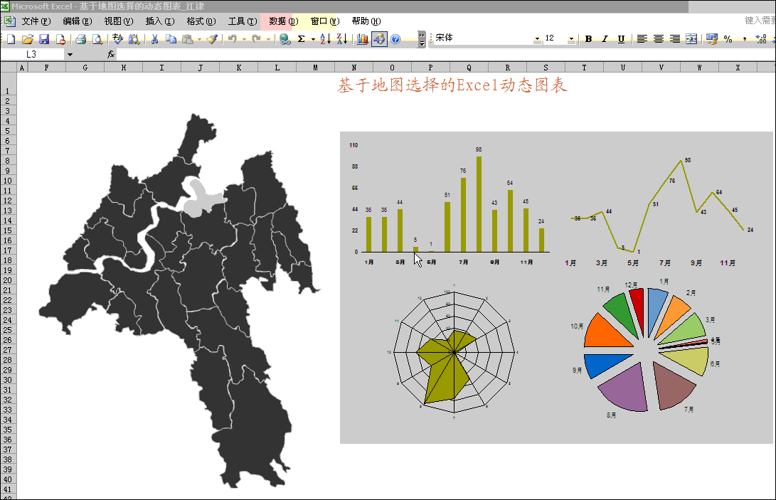 现在,用鼠标在地图上选择不同的地区,你会发现图表将自动跟随变化。至此,一个动态图表已经完成。