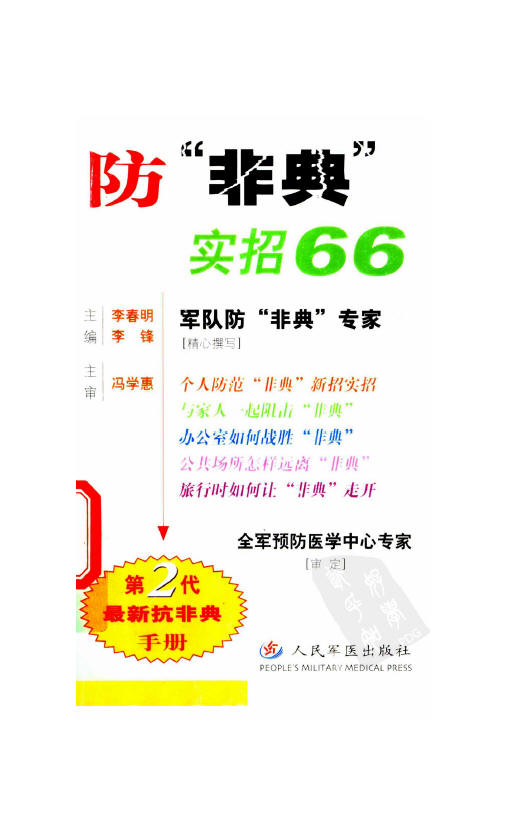 预防“非典”是关系到千家万户的大事,本书由军队预防医学专家编写,准确地论述了日常生活中防范“非典”的 66个实用、有效的措施和方法,包括个人和家庭的防护知识,在办公场所、公共场所以及旅行时怎样避免“非典”的侵犯,怎样增强自身的抵抗力,接触了“非典”患者或怀疑染上“非典”时怎么办等等。还介绍了 “非典”的病因和诊断、治疗的最新知识。图文并茂,内容新颖实用,是广大群众预 防“非典”的必读参考书。