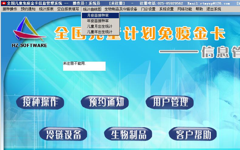 主要功能:IC卡或磁卡资料记录、日常接种操作、预约通知接种、网络数据传送、25种标准报表统计、曲线图、疫苗进销存管理、冷链设备进销存管理、防意外数据恢复功能