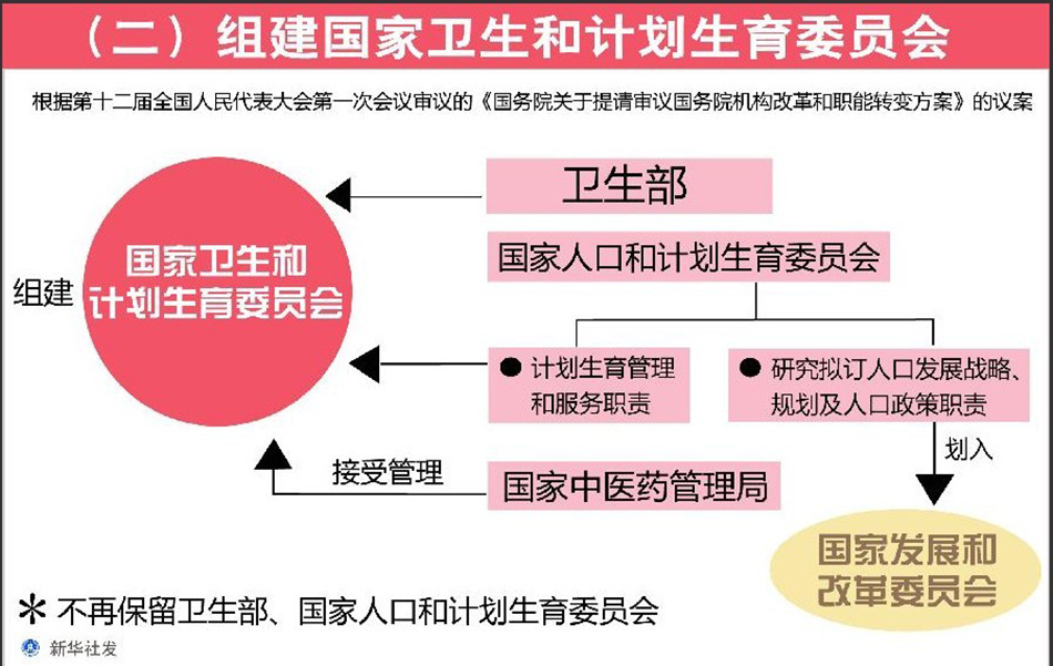 为更好地坚持计划生育的基本国策,加强医疗卫生工作,深化医药卫生体制改革,优化配置医疗卫生和计划生育服务资源,提高出生人口素质和人民健康水平,方案提出,将卫生部的职责、人口计生委的计划生育管理和服务职责整合,组建国家卫生和计划生育委员会。主要职责是,统筹规划医疗卫生和计划生育服务资源配置,组织制定国家基本药物制度,拟订计划生育政策,监督管理公共卫生和医疗服务,负责计划生育管理和服务工作等。同时,将人口计生委的研究拟订人口发展战略、规划及人口政策职责划入发展改革委。国家中医药管理局由国家卫生和计划生育委员会管理。同时,不再保留卫生部、人口计生委。