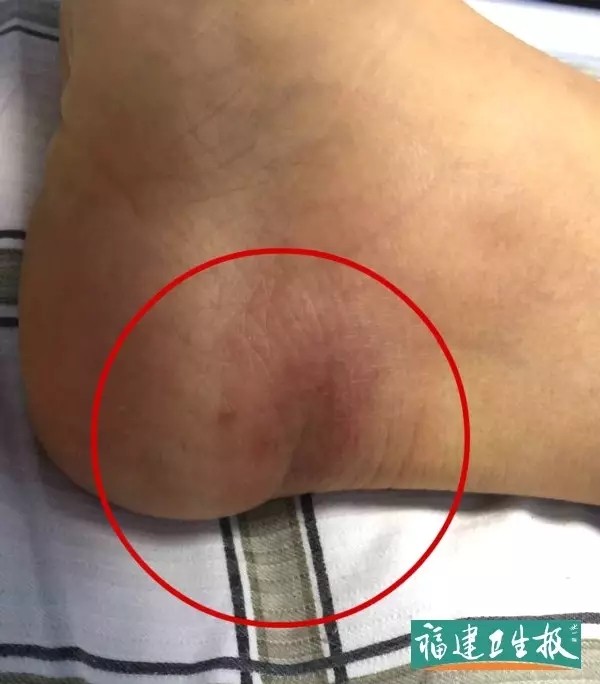 福建协和医院感染科医生邹来玉了解到,黄女士在非洲旅行时,曾被昆虫叮咬,归国后右脚后跟发现暗红色包块(见图)。
