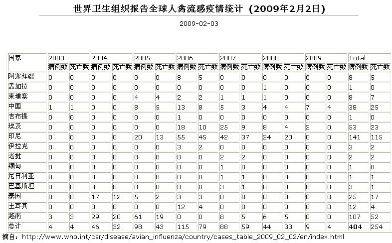 世界卫生组织报告全球人禽流感疫情统计 (2009年2月2日)