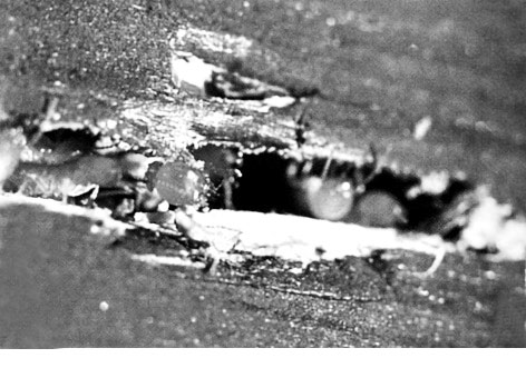 1.1.1.3 通气孔:又称通风孔、透气孔。是白蚁调节气体和温、湿度的小孔。其直径在1mm左右,孔细如针孔,非近看不能发现,孔口圆形,呈小米状或芝麻状等。通气孔数量从数个至数十个,不规则地排列成团状(梅花状)或虚线状。如果在较大木柱表面、空心墙壁、石灰砒荡天花板上,或贴近地上蚁巢(包括树巢)的表层或附近找到了通气孔,则大致可以肯定蚁巢在其中。 上述三个主要外露迹象,在一个蚁巢中,有时会同时具备,有时则只有其中一个或两个。一般地说,主巢多有通气孔,分飞孔出现于开始分飞的成年巢,幼龄巢没有分飞孔,排积物也少。 除上述三个寻找蚁巢的依据外,尚有下列线索可作为找巢辅助依据。