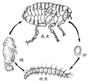 跳蚤生活史:跳蚤为完全变态昆虫,整个生活史分卵、幼虫、蛹和成虫四期,各期长短与温湿度密切相关。卵椭圆形,白色、淡黄或浅黑。其长一般为0.4~2.0mm。一般产于寄主栖居的场所。幼虫具咀嚼式口器,食料为其生活环境中的有机物粉屑,如寄主的粪渣,窝巢中的杂物,谷粉、草屑等,尤其成虫排出的血便更为重要。幼虫结茧后变为前蛹。2天左右蜕皮变蛹。蛹分头、胸、腹3部,3对胸足大部分游离。蛹色由白逐渐变黄以至棕黄。成虫羽化出茧后立即侵袭宿主吸血,以维持生命和繁殖后代,然后进行交配。1——2天后开始产卵。雌性跳蚤一生产卵若干批,每批产卵数粒,吸血可促成下一批卵成熟。雌蚤一生产卵200——400粒,最多的种类一生可产卵1000粒。