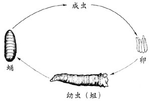 1.3 蛹:蛹呈桶状,为围蛹,蛹壳为第3龄幼虫皮收缩而成,因此它差不多完全保存有3龄幼虫的外部形态特征,但由于硬化皱缩的原因,有些特征也已不明显,而位于第一二腹节间的一对蛹气门则是蛹所特有的。蛹壳的颜色,按化蛹时间的长短由淡变深,最后成为栗褐色。此时,蛹壳内变态仍在继续进行,当变 态结束,成蝇的雏形已经形成时,便开始羽化。羽化时由成蝇头部的额囊交替着膨胀和收缩,将蛹壳头端挤开,成蝇爬出,并用同样的方法打开一条通道穿过疏松的砂土和其它基质来到地表面。化蛹至羽化(即蛹期)所需时间的长短与温度、湿度有密切关系,家蝇蛹期时间与幼虫期相仿,在35-40℃和相对湿度90%时,蛹期最短,需3-4天。蛹比幼虫能忍受较低的湿度,但相对湿度低于75%时,有的蛹要干死,低于40%则很少存活。致死温度与幼虫相同,约45℃;低于12℃时,则停止发育。在恒温(28