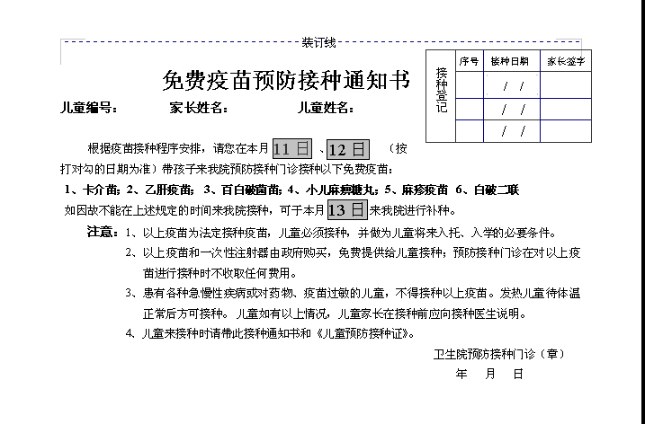 二、通知书在发放前必须填写儿童编号、家长姓名、儿童姓名、日期四项,并在相应的接种疫苗名称及接种日期上打勾。