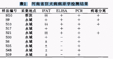 (2)病原学检测:2005年初,在近年来疫情活跃的豫东地区尝试开展犬中狂犬病毒调查,于永城、淮滨县(市)收集市售屠宰犬脑组织标本100(头)份,结果见表1。