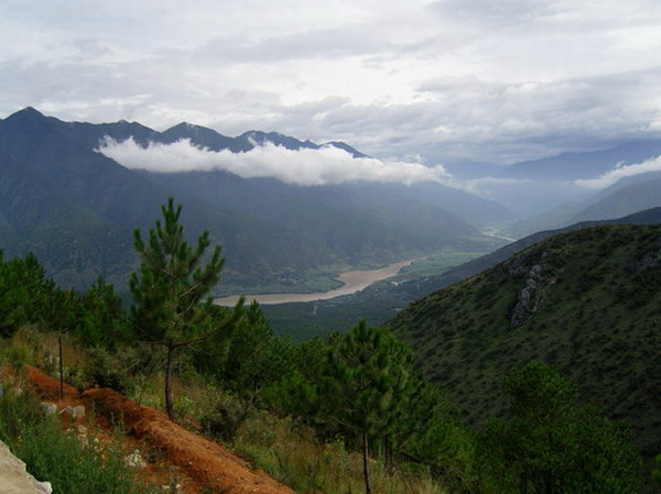 长江第一弯,在山顶上拍的,那里正在新建一座寺庙,因为还没有完工,所以是免费参观的.是最佳的观看长江第一弯的地方,.“长江第一湾”位于丽江石鼓镇,由西北向南流的金沙江在此转了一个超过270度的大弯之后向东北流去。正是由于这一转弯,使原本要像云南境内的其它两条大江----怒江、澜沧江一样要流出国境的金沙江在此返回国境,一直流到四川的攀枝花、宜宾,汇入长江,从上海归入东海,所以有人戏称金沙江为爱国江。