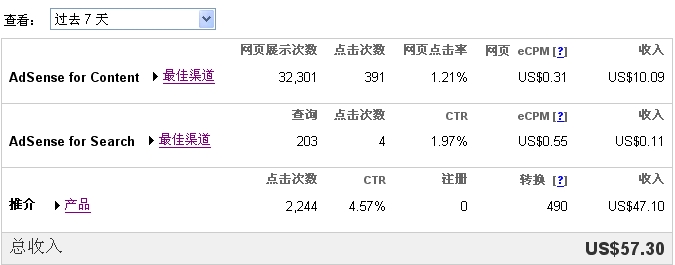 [Power=4]看了都眼馋,呵呵,[em17]你做得很好!这方面感觉跟你不在一个档次,一星期的收入还不到你的一个零头,虽然展示量要远超过你的网站。你得给我支些招啊!