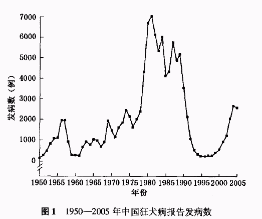 狂犬病是一种由狂犬病毒引起的人兽共患传染病。几乎所有的温血动物对狂犬病毒易感,但犬类是本病的主要宿主,在携带和传播狂犬病过程中起主要作用。人狂犬病通常由患病动物咬伤或黏膜接触后唾液中的狂犬病毒侵入体内而发生感染。狂犬病是迄今为止人类病死率最高的急性传染病,一旦发病,死亡率高达100%。全世界每年约有35 000~50 000人死于狂犬病,主要分布在亚洲、非洲和拉丁美洲等发展中国家 。 中国在 2000多年前就有狂犬病的记载 ,也是受狂犬病危害最为严重的国家之一。狂犬病在我国曾一度得到有效控制,但近年来,狂犬病不但疫情快速回升,而且出现了一些新的流行特征。笔者就中国狂犬病的流行状况、特征及其趋势进行分析与探讨,为我国狂犬病的防制对策提供依据。 中国狂犬病流行病学特征