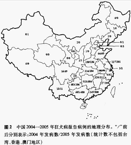 2.地理分布:自1980年至2005年,全国疫情监测表明,除青海无病例报告外,全国其他各省市均有病例报告。但各地发病数差异较大,过去 25年间发生的病例主要分布在湖南 、广东、四川、广西、贵州、江西、湖北、安徽、山东、河南、江苏 、河北、福建、云南、辽宁等省份。25年间 15个省份的累计发病数均在1000例以上,发病数约占全国发病总数的94%,其中湖南、广东、四川、广西四省区每省的发病数超过了8000例。2004--2005年全国各省市自治区狂犬病的发病数见图2。 在西北地区狂犬病的发病率则很低,甘肃 、宁夏、新疆、西藏等省份有时全年无病例或只有几个病例发生;山西、内蒙、吉林、黑龙江等省份界于两地区之间。另外,我国北京、上海、天津等大城市的发病率也相对较低。 虽然河北、辽宁等省市在 1980--1995年间发病率较高,但1996年以后发病率始终保持在较低的水平;而湖南、广西、江西、广东、江苏、贵州、湖北、安徽等省的发病率仍保持在较高水平,或在经历1995--1998年的低发期后,疫情显著回升。 值得注意的是近年来狂犬病疫情正由长江以南的传统高发地区向周边地区扩散(图2),2004--2005年河南省报告狂犬病在130例以上,山东与四川省的疫情也明显回升。